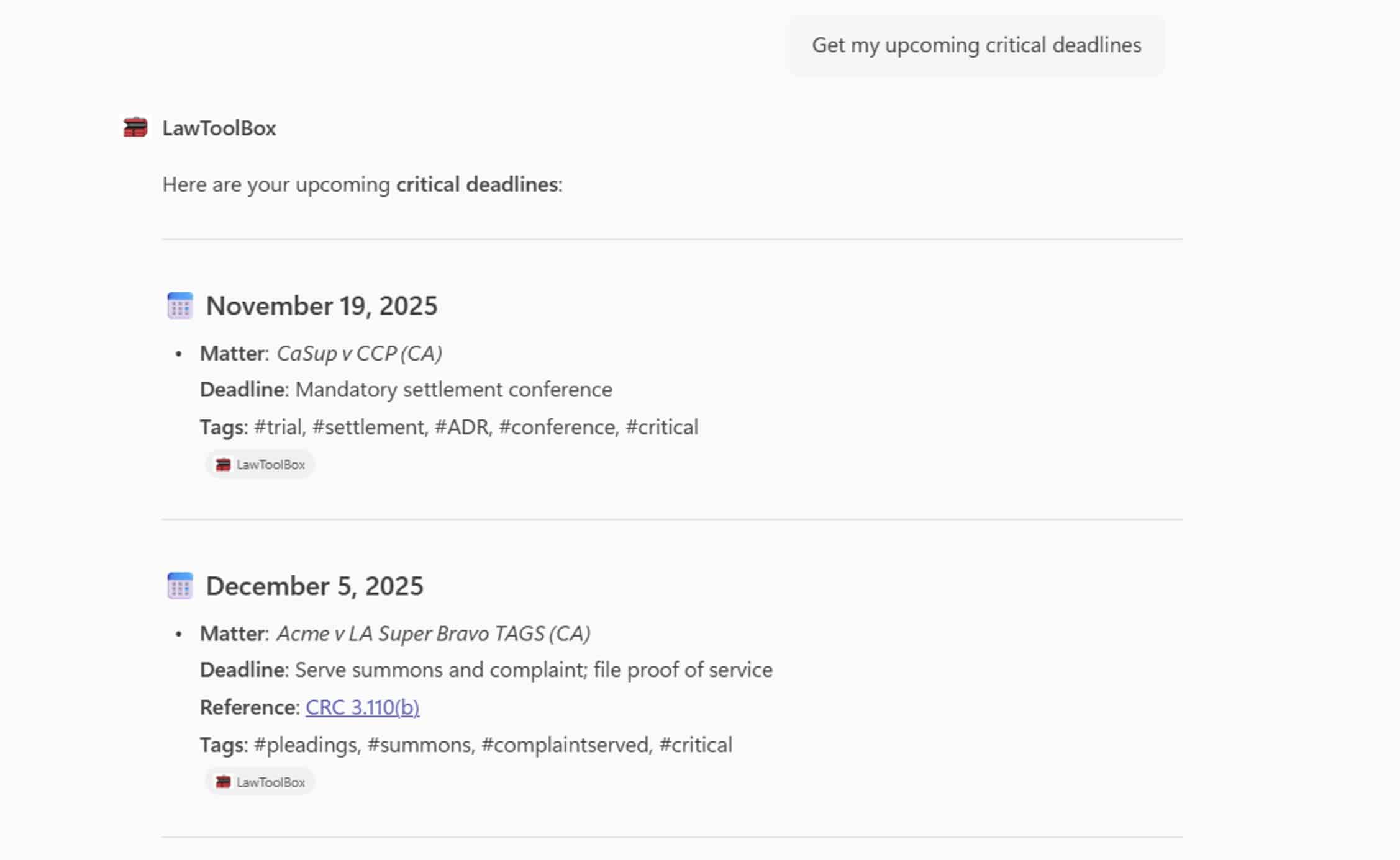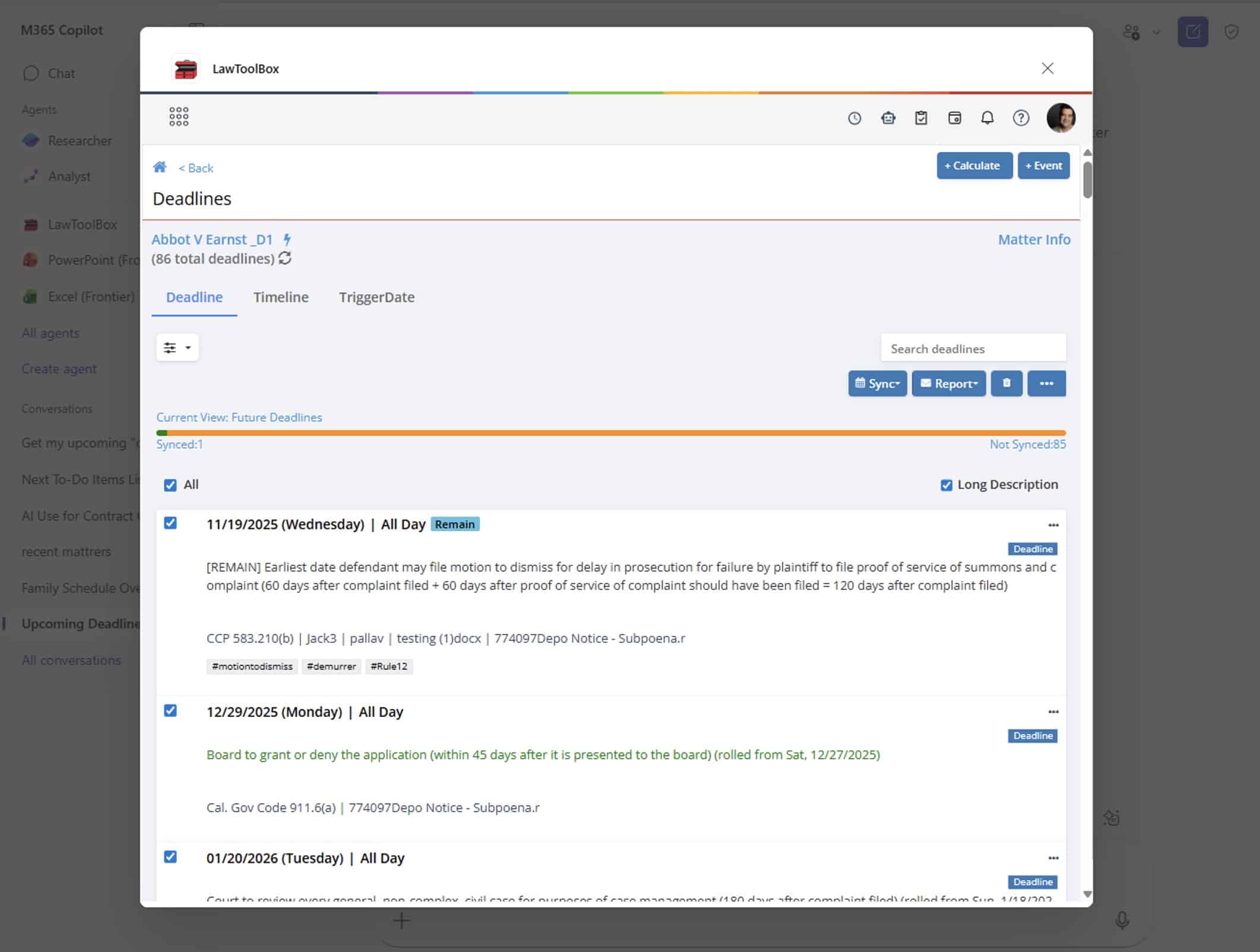 Ask Copilot about deadlines and matters, then when you want to dive in and manage deadlines you can jump into LawToolBox, do your work, then jump back to Copilot!