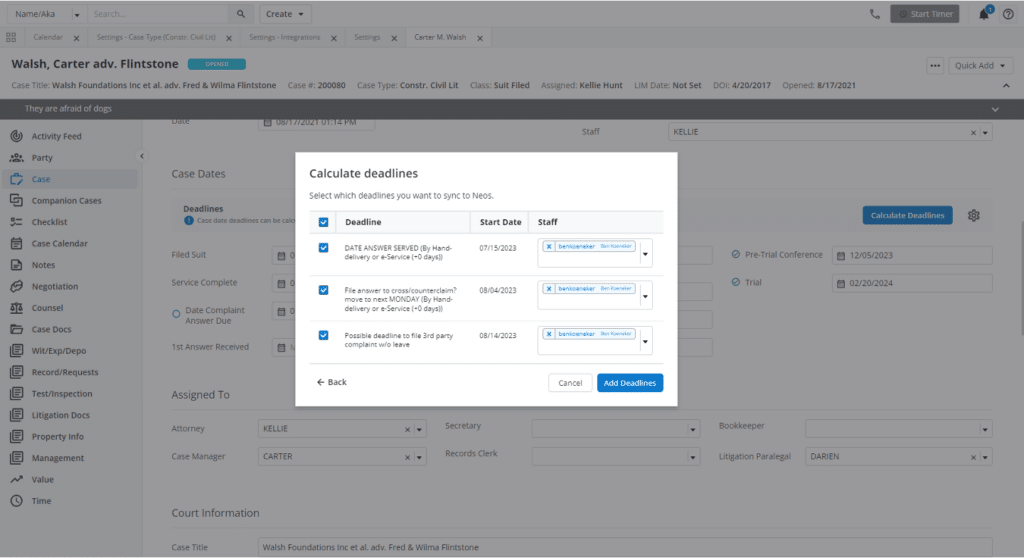 Save time with automated deadlines and legal calendaring in Neos case management software.